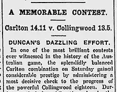 According to The Argus, "Duncan his played many fine games for Carlton, and has also been a tower of strength in interstate teams, but he has never been seen to better advantage. His marking was superb, his judgment faultless, and his kicking splendid, while his dash turned many attacks."[11]