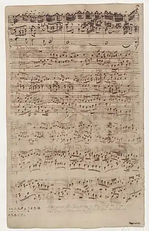 The last page of the autograph manuscript, BWV 769a, the closing bars of the canon per augumentationem. It ends manuscript collection P 271 with the surviving fragment of the so-called "deathbed chorale", Vor deinen Thron tret' ich, BWV 668 (not in Bach's handwriting).