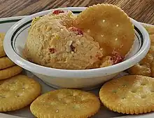 In the United States, beer cheese spread is a traditional food of the U.S. state of Kentucky.[11][12] Pimento cheese is a food in the cuisine of the Southern United States that has been referred to as the "pâté of the south" and "Carolina caviar".[13][14][15][16][17] Port wine cheese is mass-produced in the United States under several brands.[18][19] Pub cheese is a soft cheese spread that is a traditional bar snack in the United States.[20] Additional U.S. cheese spreads include benedictine, cold pack cheese and cup cheese.[21][22]