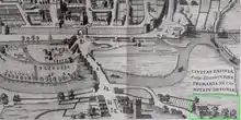 No remains of the manor house survived beyond about 1830 or 1840. It stood set back a little way on the east side of the road from Exeter to Alphington, between the Haven Road and the railway viaduct, rather beyond what was known in 1898 as Sydney Place.[4] The name "Flower Pot Buildings" may have been originally "Floyer's Plot." The land lies very low, and was intersected by streams by which mills are worked. A mill is mentioned as being on the manor of Floyer's Hayes in the time of Henry III (1216–1272). Many open spaces around the outside of the City walls are shown on the 1765 map of Exeter by Benjamin Donnas as suffixed "Hay", such as Shill Hay, Southern Hay, Northern Hay, Fryers Hay and Bon Hay. The manor house is shown on a 1573 map of Exeter[5] as a building of large size, surrounded by a stone wall and entered beneath a large arched gateway.[4] According to Worthy (1892): "It stood nearly in a line with "Snayle Tower", and on the west side of the river, and must have been very near the ancient priory of Cowick, but a little to the south-west of it".