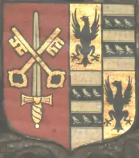 A bust of Frederick Temple designed by Sir George Frampton is located outside the Big School Room at Sherborne School, where he served as governor from 1871 to 1902.[9] The bust is inside a marble niche designed by Sir Reginald Blomfield which displays his coat of arms impaled with those of Exeter and Canterbury on the left and right respectively.[17]