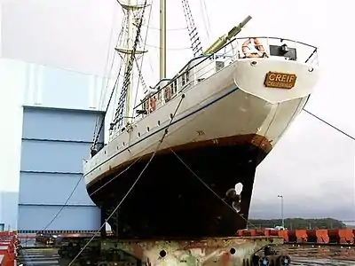 It was built in 1951 at Warnowwerft, Warnemünde/Rostock with a steel hull,[1] launched May 26, 1951 and commissioned August 2, 1951.[2] It was the first steel vessel built after World War II at the port, and was christened Wilhelm Pieck after the first president of the German Democratic Republic.[3] In 1990 it participated in the first German sail event.[4] The ship was later given to the town of Greifswald and overhauled in Rostock, and re-christened Greif.[5]