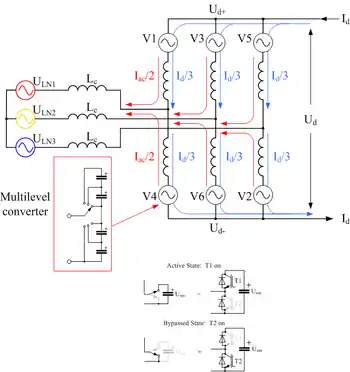 ![]() Three-phase Modular Multi-Level Converter (MMC) for HVDC. |