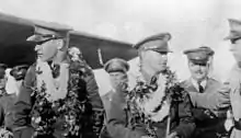 23 hours into the flight, before dawn on June 29, the crew observed a lighthouse beam on Kauai in the Hawaiian Islands at their estimated time of arrival, but still in complete darkness, decided to circle until daybreak before landing at Wheeler.[10][11][12] The Bird of Paradise completed its trip of 2,407 miles (3,874 km) in 25 hours and 50 minutes, and was greeted by thousands of spectators.[11][12] In becoming the first to make the transpacific crossing to Hawaii, Maitland and Hegenberger earned the third awarding of Distinguished Flying Cross by the Air Corps and received the Mackay Trophy for that year.[5] Of the feat, the official history of the United States Air Force states:
