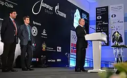 Carlsen played in the Bazna Kings Tournament in Romania on 14–25 June. The tournament was a double round robin involving Wang Yue, Boris Gelfand, Ruslan Ponomariov, Teimour Radjabov, and Liviu-Dieter Nisipeanu. He finished with 7½/10 and a 2918 PR, winning the tournament by two points ahead of Radjabov and Gelfand.[106] Carlsen then played in a rapid tournament 28–30 August at the Arctic Securities Chess Stars tournament in Kristiansund, Norway. The field featured World Champion Viswanathan Anand, female world No. 1 Judit Polgár, and Jon Ludvig Hammer. In the preliminary round robin, Carlsen scored 3½/6 to qualify for the final, second behind Anand.[107] In the final, Carlsen defeated Anand 1½–½ to win the championship.[108] Following this event, Carlsen suffered setbacks in his next two tournaments. In the 39th Chess Olympiad from 19 September to 4 October, he scored 4½/8, losing three games, to Baadur Jobava, Michael Adams, and Sanan Sjugirov; these were his first losses with the black pieces in more than a year.[109] His team, Norway, finished 51st out of 149 teams.[110]