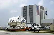 After final stages of manufacturing, systems testing and launch checkout, all ISS components are loaded into a payload transfer container in the shape of the Space Shuttle payload bay. This container safely carries the component in its launch configuration until it is hoisted vertically at the launch pad gantry for transfer to the Space Shuttle orbiter for launch and in-orbit assembly of the International Space Station.[26]