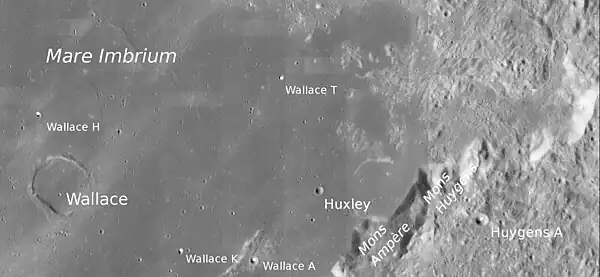 Mons Huygens is the Moon's tallest mountain (but not its highest point,[1] which is Selenean Summit). It is about 5,500 m (18,000 ft) high and is located in the Montes Apenninus.[1] Adjacent to the west is Mons Ampère. The Montes Apenninus were formed by the impact that created Mare Imbrium. The mountain was named after the Dutch astronomer, mathematician and physician Christiaan Huygens.[2]