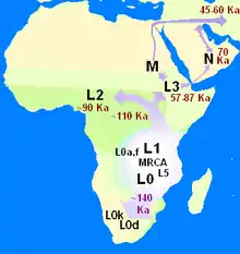 | Descendants | Mitochondrial macro-haplogroups L0, L1, and L5 |