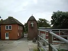 Oland Lighthouse (German: Leuchtturm Oland) is Germany's smallest lighthouse, being only 7.4 metres (24 ft) tall. It is located on the small Hallig of Oland. It serves as a cross light for the Föhrer Ley and Dagebüll channels. It is Germany's only lighthouse with a thatched roof. This small brick lighthouse was erected in 1929. Lit in the same year, it is still being maintained by a keeper. Until 1954 when it was electrified, the lantern was lit by liquified gas. For maintenance, the optic can be drawn out of the lantern casing on a slide. Its characteristic is "fixed", i.e. a continuous light, with white, red and green sectors. The red sector shines to the north and the green sector shines to the west. The white sector shines between the two coloured sectors or broadly towards the northwest or towards the town of Wyk on the island of Föhr from where it can be seen as a white light.