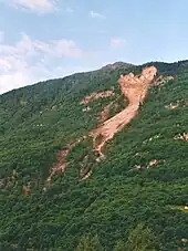 These events induced the authorities to increase the capacity of the largest retaining wall from 20,000 m3 (26,000 cu yd) to about 70,000 m3 (92,000 cu yd). The retaining wall was completed in the end of 2002. On 7–8 May 2002, about 150,000 m3 (200,000 cu yd) of rock fell over 7 hours during heavy rain from Roscioro. Only a few boulders reached the partly completed retaining wall.[11] During the night of 14–15 May 2012, there was a major rockslide above Preonzo which resulted in no deaths or damaged buildings, but did cause road closures (at intervals even the motorway). About 300,000 m3 (390,000 cu yd) of rock collapsed on 14–15 May with another 500,000 m3 (650,000 cu yd) of rock that could potentially fall in future.[12][13]
