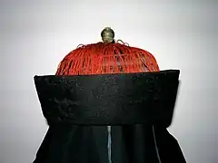 The Huangchao liqi tushi was therefore published and enforced by the year 1766; it contained a long section regulating the clothing worn by the emperors, princes, noblemen and their consorts, Manchu officials along with their wives and daughters, and also stipulated the dress code for Han Chinese men who became a mandarin and were serving the Manchu court, along with their wives and by the people who were waiting for an appointment.[25] The stipulated clothing was divided into official and unofficial clothing and was then subdivided into formal, semiformal and informal categories: formal official clothing and semiformal clothing were worn at the court; informal official clothing was worn when travelling on official business, when attending court entertainment and on important domestic occasions; non-official formal clothing was worn on family occasions.[25] Clothes were also regulated by the seasons.[25]
