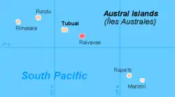 Raivavae (Tahitian: Ra‘ivāvae /ra.ʔi.va:va.e/) is one of the Austral Islands in French Polynesia. Its total land area including offshore islets is 17.9 km2 (6.9 sq mi).[1]: 205 At the 2017 census, it had a population of 903.[2] The island is of volcanic origin, and rises to 437 metres (1,434 ft) elevation at Mont Hiro.[1]: 243
