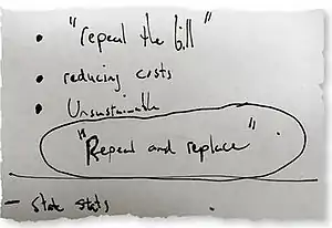 - ↑ Carl Hulse (January 15, 2017). "'Repeal and Replace': Words Still Hanging Over G.O.P.'s Health Care Strategy". The New York Times. Retrieved January 16, 2017.