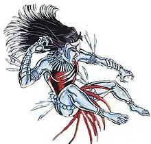 Using the electrically charged weapons of the guards to provide Warbird with a power boost, the Avengers were able to free themselves. Silverclaw attacks Kulan Gath but soon realizes her only hope is Peliali herself. Seeking to increase her mother's power to enable her to escape Kulan Gath, Lupe appeals to the Kamekeri in an attempt to restore their faith in Peliali. Her efforts succeed, and Peliali escapes Gath's initial murder attempt. Gath's dark masters claim Gath instead, and the village is restored. Peliali did not fare quite so well as her beloved village. Gath's blow hadn't killed her directly but was soon fatal. Silverclaw gets a chance to say goodbye before Peliali dies.[5]