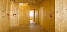 Stadthaus is the first high-density housing building to be built from pre-fabricated cross-laminated timber panels.[6] It is the first building in the world of this height to construct not only load-bearing walls and floor slabs but also stair and lift cores entirely from timber.[6]
