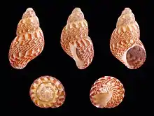 The size of the plump, oval shell varies between 3 mm and 11 mm. The shell has five or six rounded, gently convex whorls with a smooth structure, the body whorl being the largest. The shell has a short, abrupt spire. There is no distinct umbilicus. The aperture is roundish oval with a conspicuous operculum is thick and has a white calcareous surface. The colour pattern of the shiny shell is very variable and goes from cream to white with pink or purple-brown spots spirally distributed in zigzag or flamed patterns.[2][3]