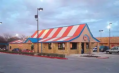 By 1960, there were stores operating across Texas, Florida, and Tennessee.[15] Inspired by his love for flying, Dobson designed the orange and white striped A-frame store in Odessa, Texas, in 1961.[1][11]
